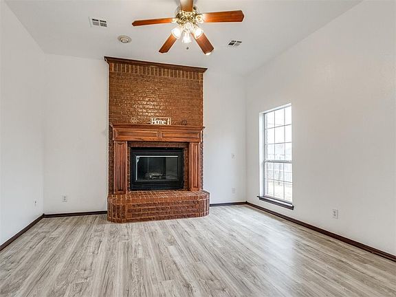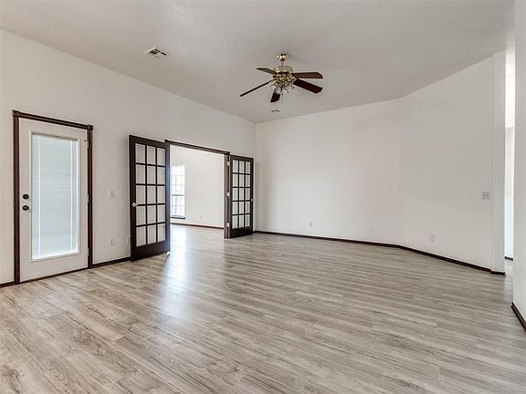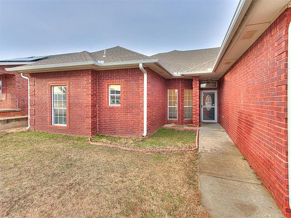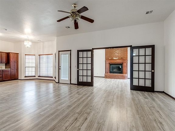 This spacious 4-bedroom, 2-bathroom home features a fantastic split floor plan with a flexible office or second living area, complete with French doors and a fireplace. The open kitchen offers newer stainless steel appliances and plenty of counter space. The primary suite includes a walk-in closet, double vanities, and a whirlpool tub, while all bedrooms are equipped with ceiling fans for added comfort. Recent updates include brand-new flooring throughout and a new HVAC system for year-round efficiency. Outside, enjoy a covered patio and a large backyard, perfect for entertaining. A two-car garage adds convenience. Located in a prime area near Tinker AFB, shopping, dining, and major interstates, this home offers both comfort and accessibility. Schedule your private showing today!
