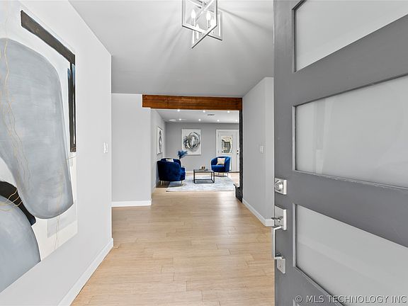Upon entering, you're greeted by an open-concept living space flooded with natural light, thanks to strategically placed windows and modern fixtures. The interior features a seamless flow between the living room, dining area, and kitchen, creating an ideal space for entertaining or family gatherings. The kitchen is a focal point of the home, showcasing high-end stainless steel appliances, granite countertops, and custom cabinetry. A large island with a breakfast bar provides additional seating and serves as a central hub for meal prep and casual dining. The home offers three bedrooms, each thoughtfully designed with comfort and style in mind. The master suite is a true retreat, boasting a spacious layout. The highlight of the master bedroom is undoubtedly the expansive walk-in closet, offering ample storage space for even the most extensive wardrobe. Adjacent to the master suite is a luxurious en-suite bathroom, featuring dual sinks, a soaking tub, and a separate walk-in shower with sleek glass doors. Two additional bedrooms share a beautifully appointed full bathroom, complete with modern fixtures and designer finishes. Convenience is key in this remodeled ranch-style home, with a separate laundry room and a guest powder room located near the main living area. The attached two-car garage provides plenty of space for parking and storage, with direct access to the home for added convenience. Outside, the backyard offers a private oasis, perfect for outdoor entertaining or relaxation. A spacious patio provides plenty of room for al fresco dining, while mature trees create a tranquil atmosphere. Overall, this modernized ranch-style home seamlessly blends contemporary design elements with classic charm, offering the perfect blend of comfort, style, and functionality.
