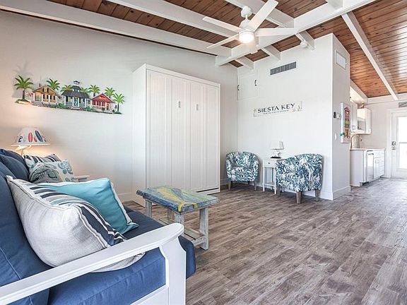 Starting at $169/night. Discover the perfect beach getaway at our charming studio on beautiful Siesta Key, just steps from the world-famous white sands of Siesta Beach. Ideal for couples or solo travelers, this cozy and well-appointed retreat offers everything you need for a relaxing escape. Nestled in the heart of Siesta Key, you'll be within easy walking distance of the beach, local shops, and vibrant dining options. Inside, the studio features a comfortable queen-size bed, a cozy seating area, and a flat-screen TV for your entertainment. The fully equipped kitchen includes a refrigerator, stove, microwave, and all the essentials for a convenient stay, while the bathroom offers a tub/shower combo, fresh towels, and a complimentary starter kit of toiletries. Step outside to enjoy the front patio or take a refreshing dip in the shared pool perfect after a day of exploring the island. Additional amenities include high-speed Wi-Fi, two on-site laundry facilities, and free parking. Whether you're planning a quick weekend getaway or an extended stay, this delightful studio offers the ideal blend of comfort, location, and laid-back island charm. Book your stay today and experience the best of Siesta Key living. Contact office for information.
