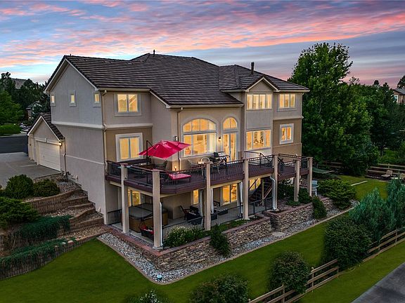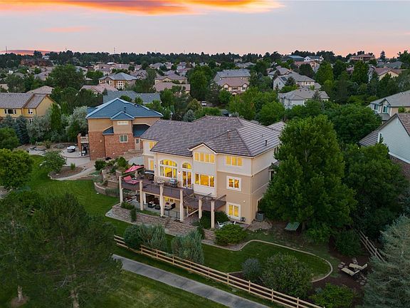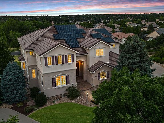Exceptional 2-story in coveted Piney Creek Village positioned on a private cul-de-sac with breathtaking open space and mountain views. Original owners' immaculate, spacious home in Centennial's most sought-after neighborhood. Discover Richmond's award-winning floorplan (Cascade) with custom enhancements. Step inside to soaring 20' ceilings, gleaming hardwoods, and windows with ample sunlight. A gourmet kitchen features a large island (bar seating), expansive pantry, and new induction cooktop. The open design seamlessly flows to the family room, where a cozy gas fireplace resides and picture windows showcase the spectacular views. An elegant, formal dining room is accessible via the butler's pantry, while dramatic French doors reveal a private study. The living room provides even more elegant space for hosting. A main level, private bedroom suite is perfect for guests or multi-generational living. Upstairs, the luxurious primary suite captures the views, alongside the spacious retreat area, separated by a stunning 3-sided gas fireplace. Continue on to the convenient coffee bar, 5-piece bath and dual walk-in closets. 3 more bedrooms sharing 2 bathrooms (dual entry and en-suite), plus a loft/library overlooking the main spaces also reside upstairs. Beautifully landscaped grounds with mature trees, seasonal perennials, elegant stone walls and winding paths is a true paradise. The upper deck offers prime views of the expansive backyard and open space while a tranquil courtyard and private hot tub offer perfect retreats. The walkout basement features a large rec area (with bar); playroom; gym; and bathroom. Premium modular wall panels ensure optimal acoustics/insulation. Enormous 900+ SF garage allows space for 3 cars, plus storage/workshop. Owned solar panels dramatically reduce energy costs. Unbeatable location in Centennial—ranked #1 Best Place to Live in Colorado. Enjoy top-rated Cherry Creek Schools and nearby trails, parks, rec centers, shopping, and dining.