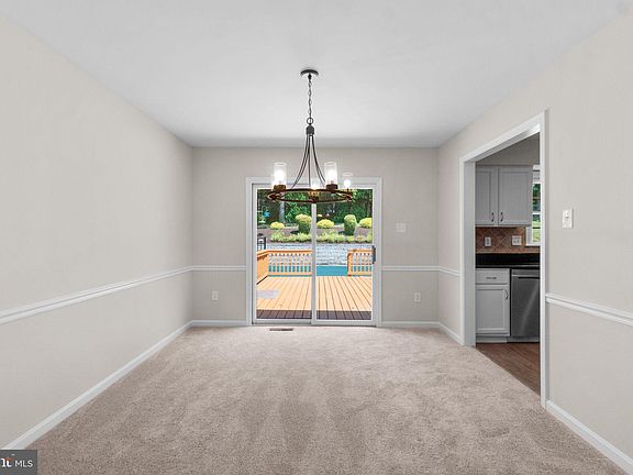 Charming split foyer nestled in sprawling Heritage Heights, featuring 1,401 sqft of living space, 3 bedrooms, 2 full baths, 1 half bath, and an oversized 2-car garage. Step into the split foyer entry and discover a spacious interior adorned with elegant crown molding and abundant natural light. Head upstairs to the main level, where you'll find a living room, formal dining room with deck access, kitchen, 2 full bathrooms, and 3 large bedrooms. The eat-in kitchen features stainless steel appliances, a stunning patterned backsplash, ample white cabinetry, and a cozy breakfast area. The owner’s suite offers direct access to the back patio, a walk-in closet, and a recently renovated full bathroom. The bathroom boasts dual vanities and an updated shower adorned with stunning floor-to-ceiling white subway tile. Head downstairs to a spacious recreation room with backyard access, a half bathroom, and a well-appointed laundry room. Relish outdoor dining and entertaining on the expansive deck or slate patio, offering views of the meticulously landscaped, partially fenced backyard and in-ground pool nestled amidst lush shrubbery and backing onto dense woods. Enjoy the convenience of nearby amenities such as Sykesville Freedom Park and Patapsco Valley State Park, shopping at Village Shopping Center and Historic Downtown Sykesville, various dining options, and easy access to commuter routes like Route 32, I-70, and I-795.