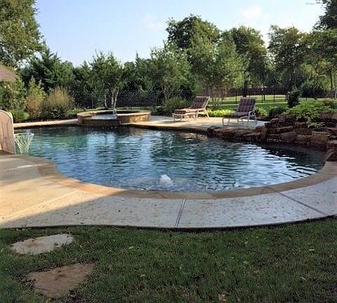 Gated Waterfront Community. Gorgeous Custom 4 bdrm, 3.5 bath, 5 car garage with pool and spa on 1ac. Open living-kitchen with view of pool has double ovens ,walk in pantry and wine closet. Master and 2 bdrms down. Spacious master & luxurious bath with jetted tub, walk-in shower & large closet with built ins. TV viewable through mirror in master bath. Game room with balcony and separate bedroom and bath up. Backyard paradise with pool & spa, covered patio with fireplace and grill. Oversized 2 car garage for boat or RV with stairs to attic storage above. Private road behind property for easy parking & pull through for RV or boat in detached garage. All HVAC units replace with Carrier system. Some windows updated