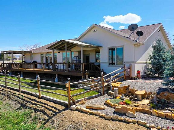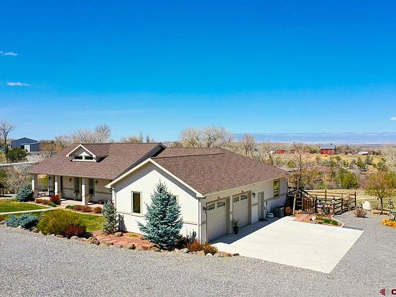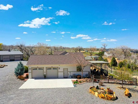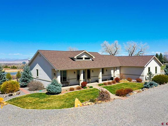 This beautiful 4+ acre irrigated Spring Creek property is located in one of the most desirable areas in the Uncompahgre Valley. There are views in all directions, from the mountains to the valley. The home was built in 2012 and offers a great open floor plan with numerous windows for natural lighting and in floor radiant heat for those cold winter nights. The tongue and groove ceilings are accented throughout the home. The kitchen has granite counter tops with under the cabinet lighting, a kitchen bar, and dining area. The master bedroom has his-and-her walk-in closets, double vanity, soaking tub and custom walk-in shower. The large covered deck overlooks the natural landscaping that includes several large trees and a pond. One of the many amenities of this property are the gorgeous views of the Uncompahgre Valley from the deck. In addition to the home's oversized 2-car attached garage, there is a large detached garage/shop with two 12x10 overhead doors. Bunkhouse and RV shed with hookups, and plenty of room for horses or other animals on the 2.5 irrigated acres of grass pasture. There is a lot more to this property than we can describe -- a must-see to appreciate!