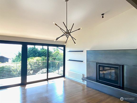 Fabulous contemporary home with wide angle views of the lake and mountains! Gorgeous great room: living and dining room spaces and an open kitchen in between. 10' granite island, teak cabinetry, shelving, sleek steel accents, Lux appliances. Hardwood floors throughout main. Gorgeous primary suite up with sweeping views, large walk-in closet, chic bath. Small bedroom could be used as an office. Lower level offers a large bonus room with gas fireplace, 2 additional bedrooms and 2 bathrooms. Outside access opens the opportunities for ADU/MIL space. Enjoy the lvl back yard for play and gardening w/sprinkler system. Easy access to your 1/4 interest in the shared waterfront offering small water craft storage and day moorage dock.