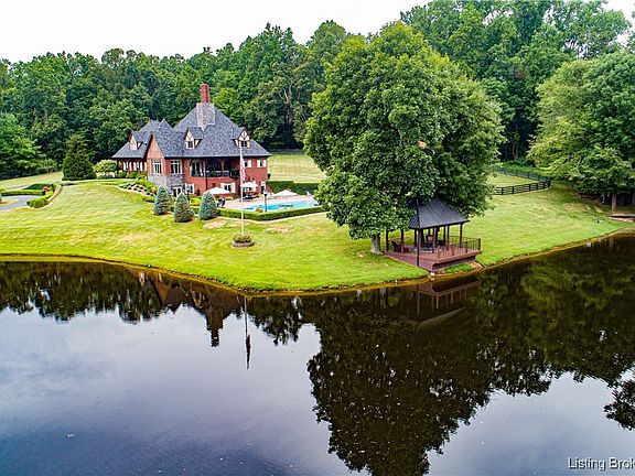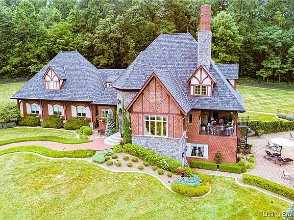 A true architectural masterpiece, this stunning English Tudor estate is one of Southern Indiana’s most admired properties. Nestled on 12+ private acres, this home is a perfect blend of classic elegance and modern luxury, offering breathtaking views, serene privacy, and world-class amenities. The owner has transformed virtually every space in the last 5 years! The great room & remodeled chef’s kitchen are the heart of the home, featuring stunning beamed ceilings, gas fireplace, custom cabinetry, massive center island w/prep sink, granite countertops & state of the art appliances. French doors open to a covered lanai w/fireplace. The main level primary suite is a retreat of its own w/remodeled luxurious bathroom & lots of added wardrobe storage. A cozy built-in office & powder room complete this level. One staircase leads to the newly designed guest suite w/dedicated bathroom on the second level, while another split staircase beacons you to a charming bourbon/wine cellar before exiting in the finished w/out LL. Here you’ll find another family room, 3 bedrooms, 2 bathrooms, an expansive laundry room & two exits to the outdoor amenities. Panoramic views stretch across the in-ground pool, outdoor living space, pool house w/full bath & bar, and two-acre stocked lake w/covered fishing deck & boat dock. The 10-stall horse barn offers an exceptional home for your horses, including separate apartment w/full kitchen & bath. So much more to offer—see full list of features & updates!