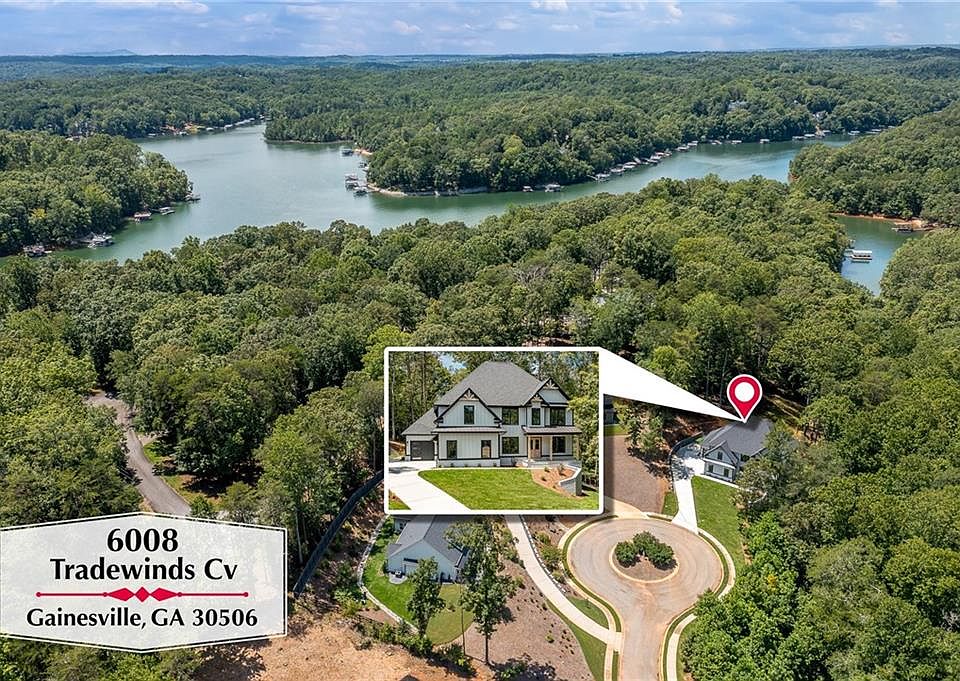 Luxury Lakefront Living at Dockside Cove. Welcome to a rare opportunity for new construction property in Dockside Cove, a prestigious gated lakeside community on Lake Lanier. This luxurious 5-bedroom, 4.5-bath lakeside retreat combines modern elegance with resort-style amenities, offering both privacy and convenience. This home offers a private DEEDED boat slip, approx. 41 ft on Lake Lanier’s Corps line, and sits on a cul-de-sac lot. Step outside to a large covered back deck, complete with a built-in gas fireplace, perfect for year-round entertaining. Designed to capture laidback feelings and fresh breezes, this outdoor retreat is ideal for gatherings or quiet evenings. Open floor plan with 10 foot ceilings, high-end finishes throughout, & thoughtful design touches features a chef’s kitchen with quartz countertops, waterfall island, pro appliances, wine cooler, walk-in pantry & butler’s pantry. Main floor includes office, guest suite complete with a private bath for visitors’ comfort, & formal dinning. Oversized owner’s suite boasts his & hers closets and spa-like bath with soaking tub & oversized shower. Upstairs media room, 3-car garage, tankless water heater for energy efficiency, irrigation system, and full unfinished basement - ready to be customized. Convenient GA400, downtown Gainesville, Dawsonville outlets, & the North GA mountains. Whether you’re seeking a full-time residence or a weekend escape, 6008 Tradewinds Cove offers unmatched luxury, privacy, and direct lake access - designed for the most discerning buyer.