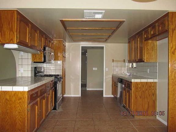 Dont miss your chance to see this charming home featuring tile and carpet flooring, vaulted ceilings, a brick fireplace with bench seating, a kitchen with white tile countertops and oak cabinets plus separate dining area, arched doorways, ceiling fans, hallway storage, and plenty of windows for natural lighting. The exterior includes an attached two car garage, a covered back patio, a spacious backyard, and curb appeal. Let this house be your cozy new home make an offer today. Call 661-377-3800