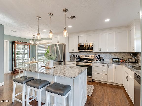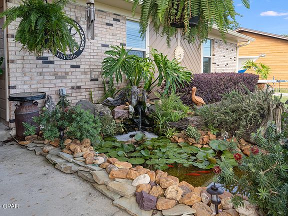 Upon walking up to the front door you will see a magnificent custom-made koi fish pond and true oasis with landscaping that begins right as you walk up to the home. As you walk through the front door into the foyer that has beautiful herringbone pattern on the entryway. flooring. Looking through you will see a large, open living room with a beautiful vaulted ceiling and brick fireplace. The perfect spot to spend time with family and not feel confined. Offering durable LVP throughout, the open concept features a beautifully-crafted open kitchen/dining area which features a large island with an abundant amount of countertop area and plenty of cabinets for storage. Around the corner is the large laundry room/pantry. The laundry and pantry room also give access to the large 2-car garage.