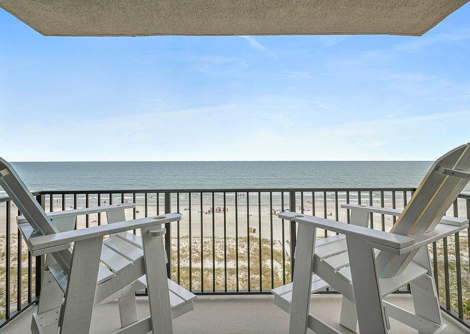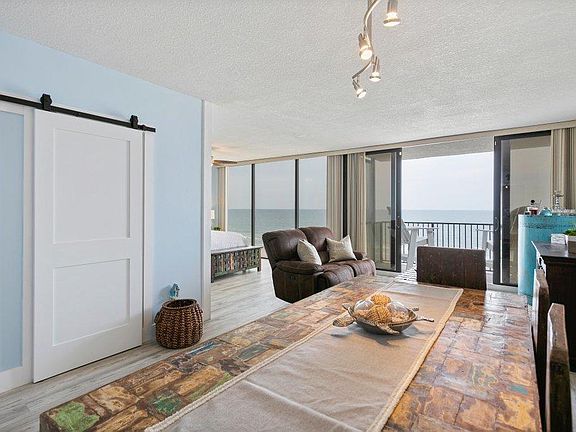 6th Floor skyline views await you in this recently renovated oceanfront condo. This was a 2 bedroom floor plan at 1,080 sq feet. The previous owner had the bedroom wall removed to afford all eastern floor to ceiling panoramic views of the water! Beautifully redone with Luxury Vinyl Plank flooring, white open kitchen, barn doors, updated bathrooms, freshly painted, stainless appliances, new AC & more! Included is a storage closet on the 6th floor just outside the unit to store all of your beach gear and a 1 car parking space in the covered garage in the building. The unit is move-in ready and is the perfect summer escape or full time residence. Las Brisas is well managed & follows a minimum 30 day rental policy. Fantastic pool & club room. Walk or bike to restaurants, shopping, and fun! fun!
