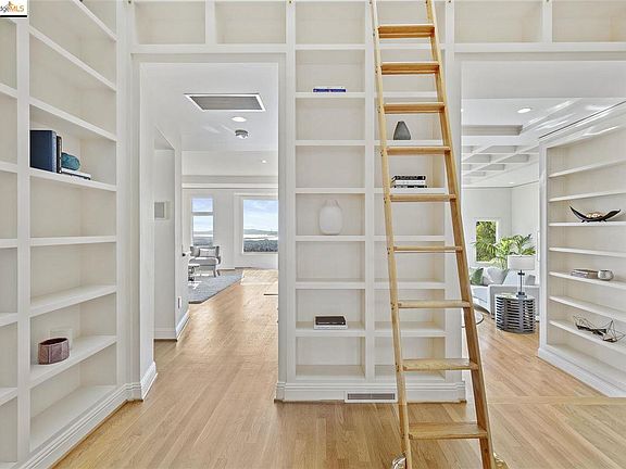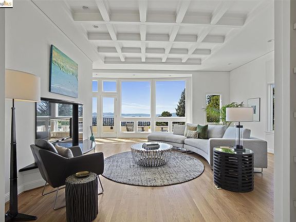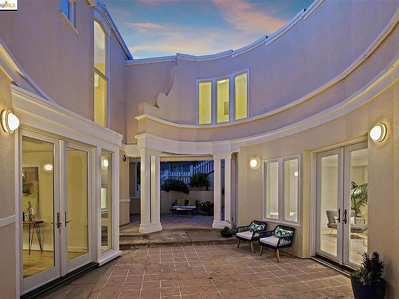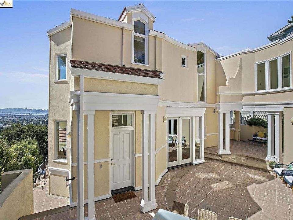 Beyond its own deep garden and the leafy Berkeley foreground, this handsome Claremont Hills home commands breathtaking vistas of the cities, bridges and waters of San Francisco Bay. The elegant European design features dramatic, vaulted spaces; large, light-filled rooms; broad balconies and patios; and an elevator serving all three floors. Enter the upper level through the garage to the luxurious master suite, spacious office, and upper balcony. Or descend the covered staircase to the entry patio, soaring foyer and vaulted, sky-lighted, two-story library.The living and family rooms open west to a curved balcony; the kitchen and dining room east to a courtyard and versatile studio. Downstairs are three bedrooms, two baths, a second laundry, and a third view terrace with street and garden access. The garden gate opens to a footpath to the Claremont Club and Spa. Enjoy panoramic views from Marin to the South Bay from nearly every room and the pleasures of this fine Claremont neighborhood.