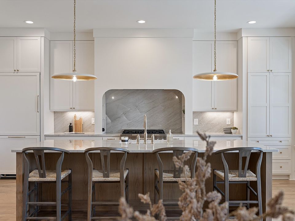 The kitchen is a true showpiece featuring floor-to-ceiling custom cabinetry, a expansive curved hood, integrated paneled appliances, a 10’ white oak island, and gorgeous quartzite countertops and backsplash. A curved dining buffet with storage and white oak shelving creates architectural interest. The walk-in pantry is a retreat of its own, complete with tall cabinetry, designer tile flooring, natural light, and a custom door.