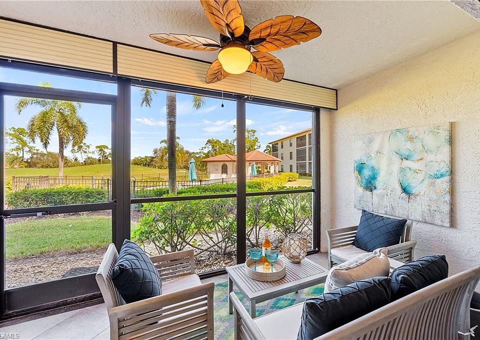 Enjoy the beautiful sunsets and panoramic views of the Royal Palm golf course, pool and lush landscaping from your screened-in lanai. Highly sought after, ground floor 2bed/2bath condo, located in desirable Lely. Light, bright with an open floor plan perfect for entertaining. Updated kitchen with tray ceiling, new dishwasher and all stainless steel appliances, breakfast bar area, and built in desk. Large master bedroom, ensuite bathroom with walk in shower and large walk in closet. split floor plan with guest bedroom and bathroom allowing for privacy for guests visiting. Good size laundry room with storage area. Golf membership is optional; reasonable social and golf memberships are available through Royal Palm. Prime location in a beautiful area of Naples, close by to fantastic dining, beaches, shopping, Naples pickleball Center and entertainment. Eaglewood is a very well maintained community while keeping maintenance and condo fees low!