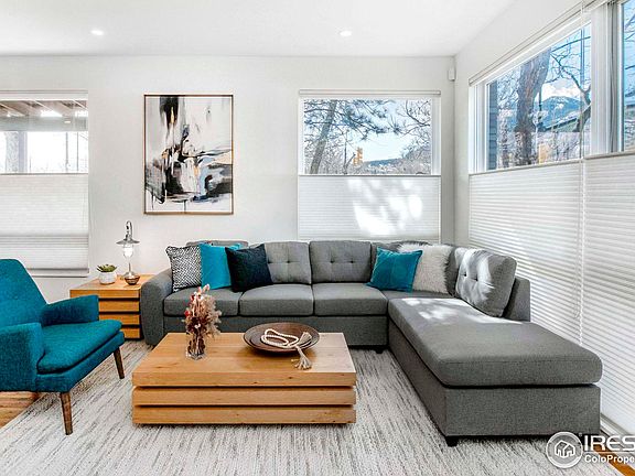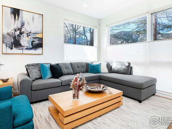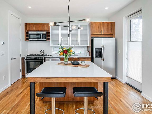 Natural elements of reclaimed wood and metal meet streamlined, modern design in this stunning townhome. Nestled in the coveted West Pearl District, a sophisticated interior flaunts hardwood oak flooring on the main and upper levels complemented by solid walnut cabinetry and upscale finishes throughout. An open, main level floor plan with 9' ceilings allows for ease of functionality, showcasing stunning Flatiron and Flagstaff Mountain views. Surrounded by tall windows, a bright living room flows into a stylish, modern kitchen that features walnut cabinetry, quartz countertops, an island and Bosch stainless steel appliances. The main level opens to a South facing deck with access to a pocket park. An elegant half bathroom completes the main level. A reclaimed wood floating staircase ascends to an upper-level primary suite offering a private balcony, walk-in closet and a front-loading washer + dryer set. An en-suite primary bath offers a walk-in shower with a rain shower head and double vanities. Ascend a modern spiral staircase to find a partially covered, expansive rooftop deck with unobstructed mountain views, allowing for an ideal entertaining space. The lower level features a family room and bedroom with its own full bathroom. Access the amenities of West Pearl Street and local trailheads within moments of your front door.