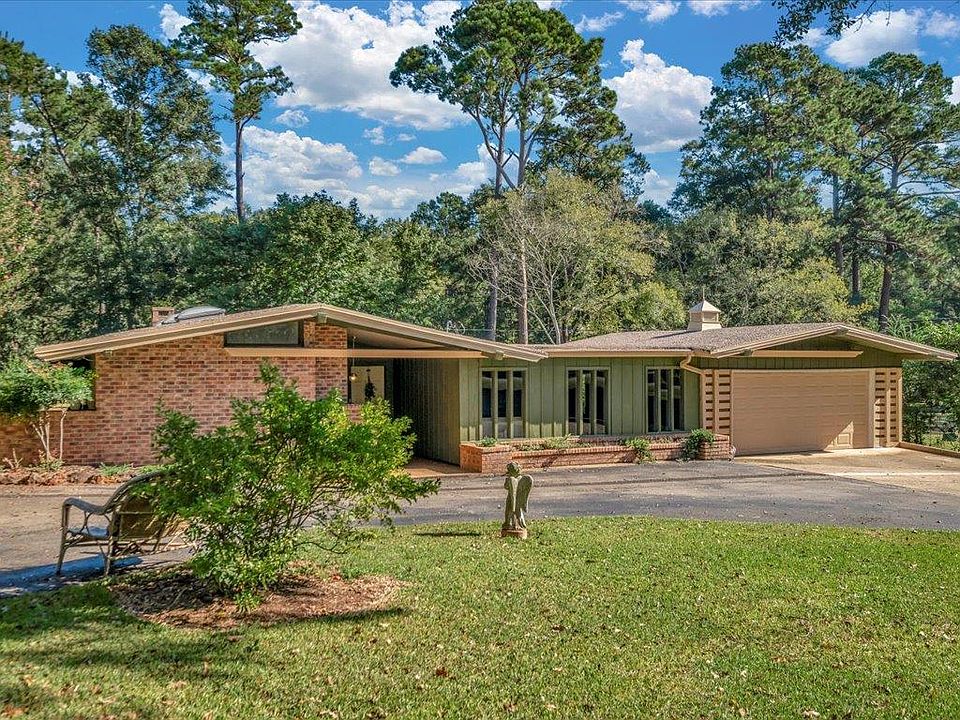 Discover timeless Mid-Century Modern design on 1.49 acres in the desirable City Lake Addition along the Carrizo in San Augustine, TX! This well-maintained 3 bedroom, 3 bath home showcases signature 1960s architecture with low rooflines, clerestory windows, brick accents, and a unique tar and gravel style roof. Expansive windows and an entry courtyard highlight the seamless connection to nature, while multiple patios and a covered outdoor space invite relaxation. The foyer opens to formal and casual living rooms, with a large den and sunlit dining area offering plenty of space to gather. The primary suite is privately situated with access to the patio, and two additional bedrooms share their own wing. A central kitchen, laundry room, office, and abundant storage ensure comfort and functionality. A rare opportunity to own a beautifully preserved Mid-Century retreat surrounded by trees, located just down the street from boat access at City Lake and only minutes from town.