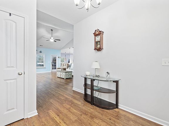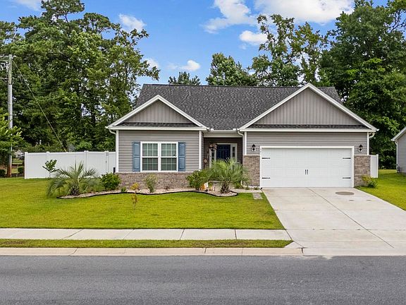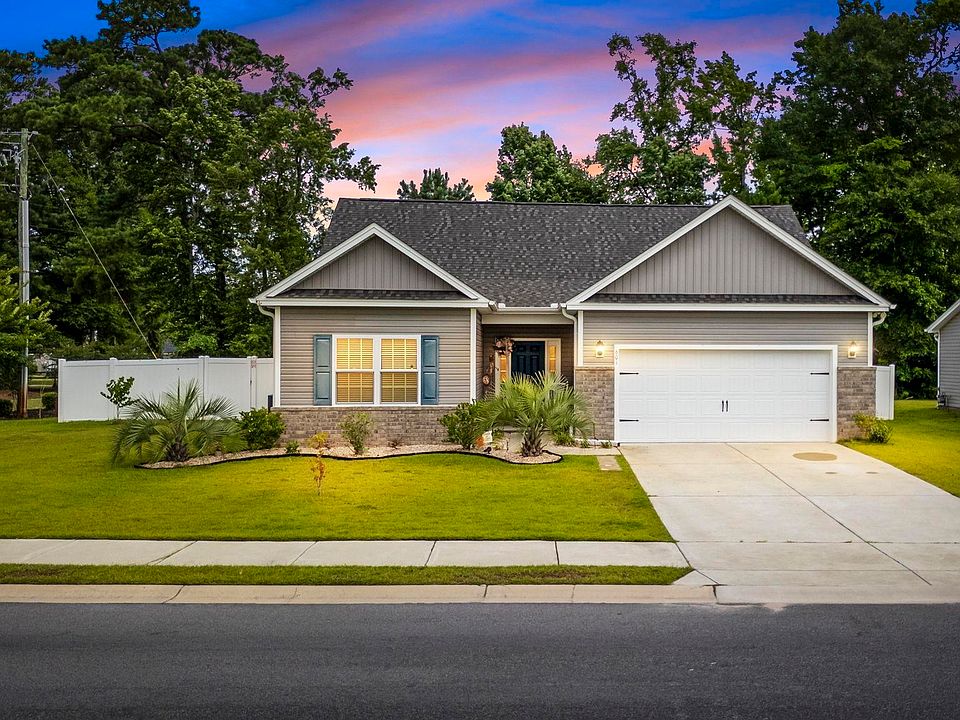 Welcome Home! This charming three-bedroom, two-bathroom single-level home offers a spacious and open floor plan, perfect for comfortable living. As you enter, you'll be greeted by a welcoming foyer, highlighted by a sliding barn door that separates the entry from the two guest bedrooms. The living area is designed for relaxation, featuring vaulted ceilings and beautiful Luxury Vinyl Plank (LVP) flooring. The space flows seamlessly into the dining room and a spacious kitchen, which boasts a breakfast, pantry, under-counter lighting, a ceiling fan with remote control, granite countertops, a tile backsplash, stainless steel appliances, a natural gas stove, and a range hood.  The master bedroom offers an enlarged footprint, with a tray ceiling, ceiling fan for added comfort, engineered hardwood flooring, and a spacious walk-in closet. The ensuite master bath, connected to the master bedroom, includes tile flooring, a linen closet, and a tub/shower combination. One of the highlights of this home is the screened porch and extended patio, perfect for outdoor entertainment. The fenced-in backyard provides privacy. Additionally, there is 220V wiring for a hot tub with the breaker box located outside, making it easy to install your own spa. The irrigation system runs off a separate water meter, ensuring your lawn and garden stay lush and green.  Located on a corner lot, there are no houses to the rear or on the left and directly across the street is pond. Barons Bluff North is conveniently located 3 miles to Hwy 90, a thirty-minute drive to sandy beaches of North Myrtle Beach. Also, has access to first class golf courses, plenty of shopping and a variety of restaurants.  Ask your Agent for a complete list of this home's upgrades. This home is not in a designated flood zone.