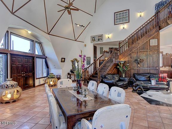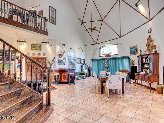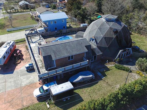 Perhaps one of the most unique homes in our area, this custom built 4 bd/4 bath home has 4425 sq. ft and an open floor plan concept like no other. The ''Dome House'' in Geodesic style is unique not only in appearance, but also location. Nestled among 3 combined lots, completing a .45 acre corner lot, it is conveniently located in the heart of Carolina Beach. The kitchen is the center of the home with both electric and gas ranges, granite, triple sink plus more! From the kitchen you enter additional space (not dome featured) with laundry room, full bath, large storage area and office. The dramatic 36' ceiling is the central focus of the main living area with Spanish tile floor, wet bar, kitchen, owner suite and bath. The owner's suite is very spacious with separate shower and oversized bathtub. The grand oak staircase leads to two additional bedrooms and a bath. The separate entrance guest quarters makes it easily available for rental income throughout the year. One bedroom, large living area and full kitchen with a spacious patio/porch to enjoy the outdoors. All located close to shopping, dining, a vibrant bar and music scene, parks and so much more.