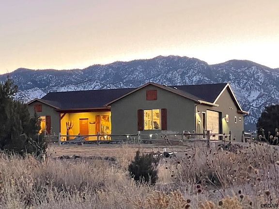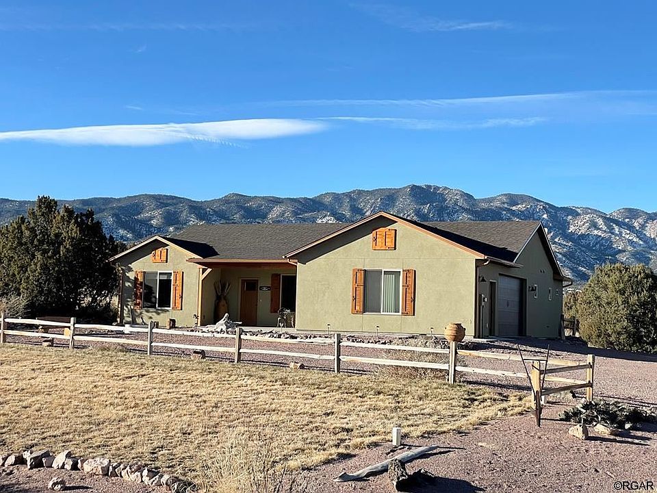 One of a kind, Custom ONE LEVEL home engineered with NO STEPS! Completed in 2019. Well designed SPLIT BEDROOM open floor plan with 9 FOOT CEILINGS throughout. Spacious 1,738 sqf. rancher with 3/4" thick SOLID RED OAK FLOORS in the entire home. HICKORY kitchen cabinets with BLACK WALNUT accents. Black STAINLESS STEEL APPLIANCES. Walnut BUTCHERBLOCK island! Microwave range hood is VENTED to outside. The Master bedroom has its own 8' PATIO DOOR with PEACEFUL MOUNTAIN views ! Master bath features DOUBLE SINKS, large walk in CULTURED GRANITE WALK IN SHOWER, and a PRIVATE water closet! Natural Gas appliances include Navien TANKLESS water heater, dryer, furnace, and range make life comfortable and increase savings! Additional savings come from the upgraded FOAM insulation and TOP OF THE LINE MILGUARD TUSCANY LOW-E WINDOWS. Exterior of home is LANDSCAPED, and blends in with natural terrain. Enjoy your own private, graveled WALKING PATH on your 2 acres! Oversized ATTACHED 2-1/2 CAR GARAGE. The insulated and finished detached 816 sqf GARAGE/ CARPENTRY SHOP is ready for you with 220 electric and a wood stove that keeps you toasty warm. Enjoy amazing views of the Wet Mountains and Colorado wild life. But wait there's more! There is a 20' x 10' mini barn with an attached 22' x 12' enclosed truck port. In addition, there are 2 more small buildings for storage! Super home on 2 ACRES with great VIEWS and a great LOCATION, just 5 minutes to the RIVERWALK and Hwy 50! Call now!