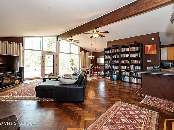 Your own private & serene sanctuary on a full acre overlooking the canopy-top of Fox River Grove, a unique gem of a property! The grounds are furnished with perennial gardens, a creek, and multiple large decks for enjoying the great outdoors! Oversized second garage great for housing your outdoor "toys." Through the front door you'll enter into the dramatic "great room" with cathedral ceilings, Brazillian cherry hardwood floors, and plenty of natural light! Three generously sized bedrooms including a massive second story master suite with a large walk-in closet and a brand new spa-like bathroom! Newer metal roof is hardy and built to last! It's not often you come across an acre of land 3 minutes from downtown and the Metra! You have to see this home and property in person to really appreciate it! Highly regarded FRG schools and Cary-Grove High.