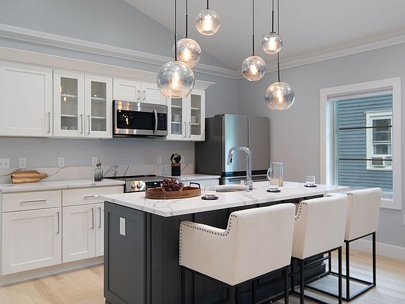 This modern kitchen boasts all stainless steel appliances, including fridge/freezer, microwave, dishwasher, range, and oven. The stunning island counter offers seating for three.