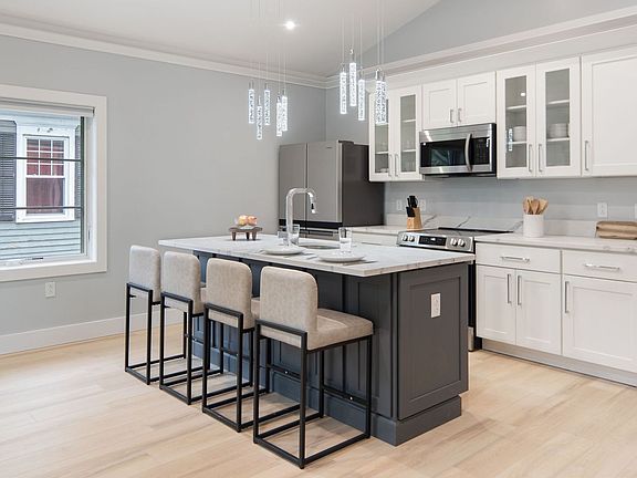 This modern kitchen boasts all stainless steel appliances, including fridge/freezer, microwave, dishwasher, range, and oven. The stunning island counter offers seating for three.