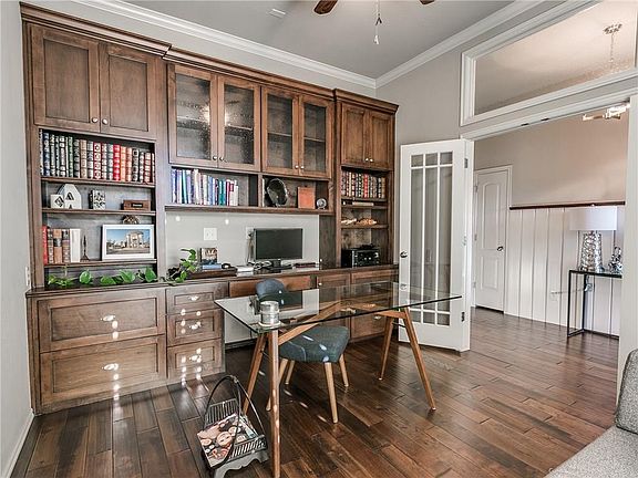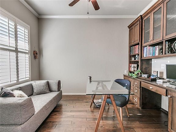 Beautiful Bungalow 3bed, +study, 2bath, 2 car garage home on 1/5 acres (mol), in the sought-after Arbor Creek neighborhood. Hardwood floors in foyer, study, living & hallway, granite counters throughout, and plantation shutters in study & formal dining. HUGE kitchen for cooking & entertaining with island, breakfast bar, pantry & floor to ceiling buffet. Open living room has stacked stone fireplace. Formal dining area/flex room. Expansive Master Suite with walk-in closet, double vanities, large shower & jetted tub. Study/optional 4th bedroom has custom, built-in desk, bookshelves and file drawers. Surround Sound speakers in the living & back patio. Storm Shelter in Garage Floor. Front covered porch has a swing, lush landscaping and mature trees. The back yard is expansive and backs to small greenbelt. The covered back patio has a natural gas connection for easier grilling with family & friends. Just 1-3 minutes to I35, Restaurants, Shops, Groceries, Integris Edmond, etc.