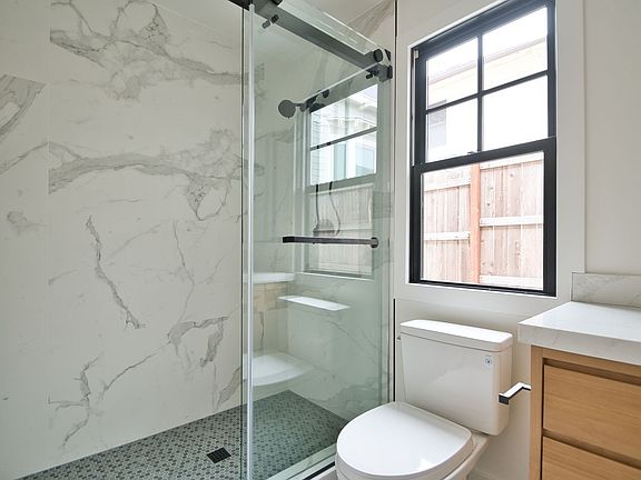 Beautiful bathroom with large shower with marble stone fabricated walls, matte grey hex tile, glass shower enclosure and French oak vanity with marble top, all with black fixtures.