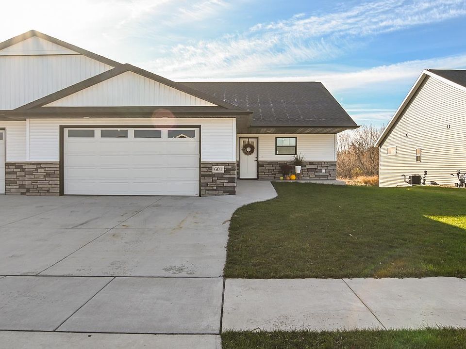Stunning zero entry ranch home w/ zero lot line situated on a generous sized lot, backing up to a pond & walking trails. Open concept layout w/ cathedral ceilings & cozy built-in fireplace. Gourmet kitchen w/center island, granite countertops, walk-in pantry & appliance pkg. Primary bedroom suite w/tray ceiling, WIC & private full bath. Add'l bedroom plus 2nd full bath is down the hall. Drop all area & FF laundry complete main floor. Full LL w/daylight windows make the spacious rec room & 3rd bedroom light, bright & airy. Unfinished area for storage, stubbed for 3rd bath. 2 car attached garage w/ openers. Relax on the deck as you enjoy a little peace & quiet w/ no neighbors behind you. Edge of town location w/ hwy access for easy commute. Schedule your showing today! 48 hr BA requested.