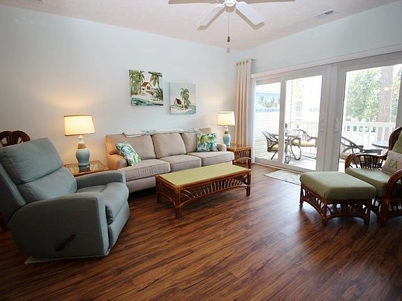 You won't want to miss this great 3 bedroom 2 bath 'Sea Star' Condo in Ocean Keyes new on the market - it won't last long. Just blocks to the beach and main street come and enjoy this light, bright and beautifully appointed condo. Most furnishings convey, please ask your agent for more information. The condo has granite counters in kitchen and has been beautifully updated flooring a few years ago with wood look LVP in living, dining, kitchen and halls, tile in baths, and new carpet in bedrooms. This is a perfect primary, 2nd home or could be used as a long term or short term (7 day min) rental. What a find - great spaces inside and a large 7'3x26'10 screened porch overlooking a pool. Neighborhood amenities include gated entrances, 6 pools, tennis courts, work out facility and owners club house.