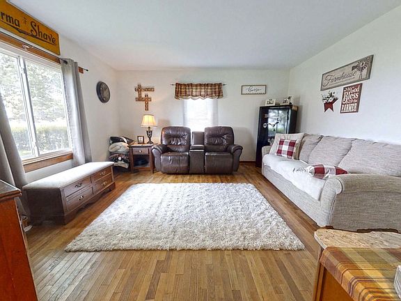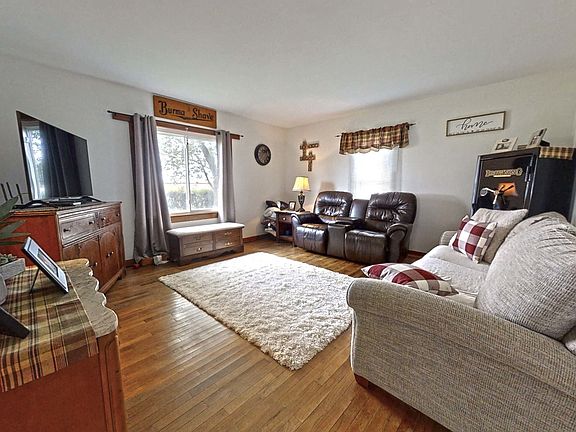 Nicely updated house on 2.86 acres, on the edge of town, with 2 garages! Move In Ready! Take the Online Virtual Walk Through Tour to view ahead. This home features a 1.5 story floor plan with nice space throughout. The main floor has a living room, dining room, kitchen with all appliances, laundry room, 1 bedroom and the full bath. There are 3 bedrooms on 2nd floor, one was turned into a walk in closet but can be converted back. There is a true walk in closet in hallway for use too. There is a breezeway that leads to the 1 car attached garage. Very well maintained home has many updates: Newer furnace and tear off roof in 2013. New siding on detached 2 car garage in 2013. Newer Windows. House has an original hardwood floors except kitchen, utility room and bathroom. Enclosed porch or breezeway of 180 sq ft is not included in Sq Ft. Water softener is rented. The prairie grass brings in approximately $500/year from the state. Seller including a 1 year home warranty as a bonus for buyer. Request Pre-approved buyers only to physically view.