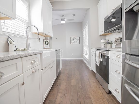 Farm sinkPicture perfect poolCozy yard areaMature treesCovered patioWalk in closetCustom kitchen cabinets