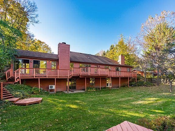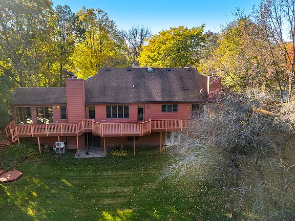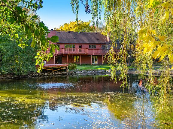 Welcome to your own private retreat! This 3 bedroom 3 bath walkout ranch has an amazing view right outside the back door. Step out onto the deck and take in the serenity of your private pond and sandy beach. 1.13 acres of wooded privacy yet conveniently located in town near the aquatic center, parks and Library. The main floor boasts a formal living and dining room, heated 3 season room with knotty pine walls, kitchen with breakfast bar, and 2 bedrooms.The Master bedroom has its own fireplace as well as sliding glass doors leading out to the deck. There is also a loft which is perfect for your home office. Huge walk in attic for storage or finishing to your liking. The lower level walkout has a wet bar, a recreation/ family room area along with a 3rd bedroom . Sliding glass doors lead out to brick paver patio . The views from the lower level are just as amazing. Grab your fishing pole!:)