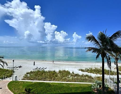Beautiful, sweeping views of the pool, beach and gulf from this corner location, direct beach front, Longboat Key Towers Condominium. Walls of windows on two sides of the living room allows for stunning panoramic views all the way up the beach from this furnished, beautifully renovated modern masterpiece with beautiful cool marble flooring in the major rooms and bamboo flooring in both bedrooms. Both bathrooms have also been beautifully renovated. The residence has two terraces one w/morning sun and beautiful golf course views from the master bedroom terrace and pool, beach, gulf and sunset views from the living room terrace. The height of this location allows for the best views of the white sand beach and turquoise gulf waters and gives that feel of a beach home. An $11 million dollar renovation was completed that included; balconies resealed, impact resistant windows installed, new roof, exterior re-surfacing, new pool and spa, paver brick driveways, elegant modern lobby, fitness center and steam sauna. The condominium is very well run with an on-site manager and 24 hour gated access. Longboat Key Club offers golf, tennis, spa and fitness. This is a wonderful location behind the gates of the Longboat Key Club with that coveted south Longboat address and easy access to St. Armands Circle and downtown Sarasota. Additional storage is on the 1st floor and two covered parking spaces are included. The 1,714 square footage of this apartment was supplied by the original builder of Longboat Key Towers.