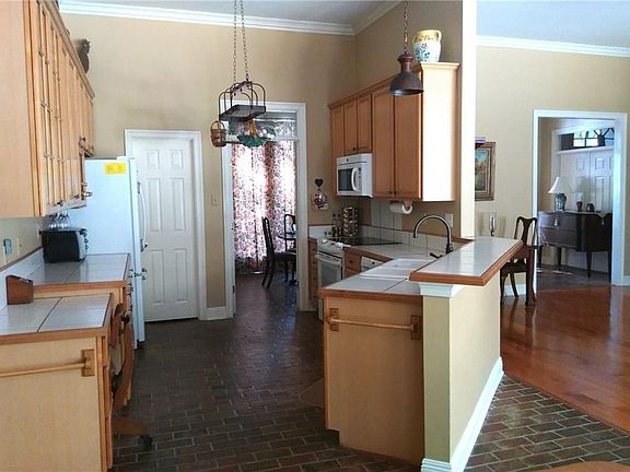 Inviting home on wooded corner lot offers open floor plan, brick floors, 11 & 9 ft. ceilings, crown molding, cased windows, & 3 patio areas only 1 mile from bridge. Den w/bookcases, wall of windows & FP w/gas logs. Split floor plan. Picture molding in dining room. California closets in master & pantry. Bathrooms are updated w/granite, new faucets & lighting. Separate toilet areas/both baths. Foyer features fan window, transoms & French doors. New roof 2019. Flood zone X. Includes shed & sprinkler system.