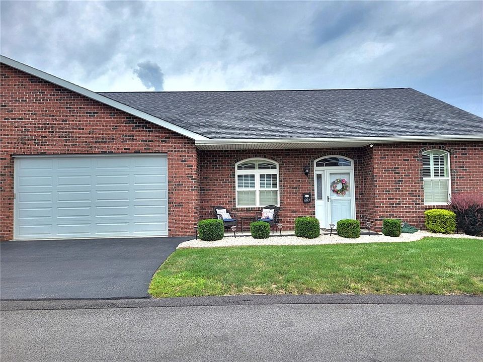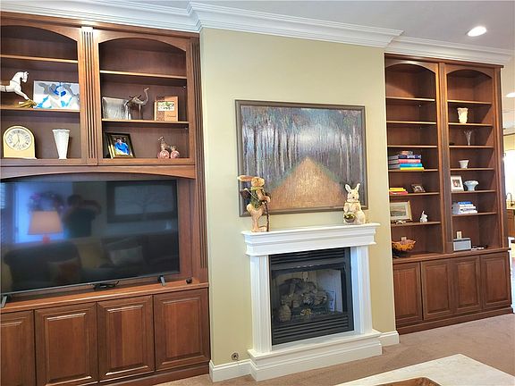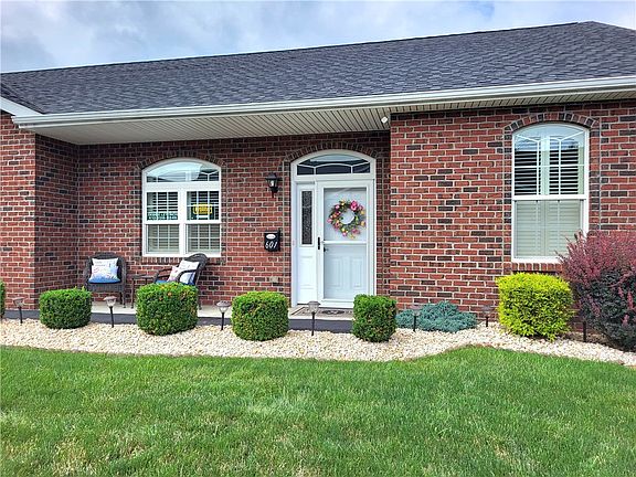 Luxury 1-floor living in this rarely used condo! No expense spared in this brick home with upgrades including 42' custom cabinetry in the kitchen with quartz countertops, roll-out shelves, soft-close drawers and upgraded appliances. Water-proof luxury vinyl flooring adorns the kitchen, foyer and dining room. 10 ft ceilings, 8 1/2 ft solid wood doors, beautiful crown molding and plantation shutters are seen throughout. Floor to ceiling shelves and cabinets surround the gas fireplace and mantle. An open floor plan includes a spacious dining room brightened with light coming from sliding glass doors that lead to the 31 ft concrete patio. Primary bedroom is king-size with an impressive walk-in custom closet and master bath! Extra wide doorways, roll-in showers, custom raised vanities with quartz counters, soft-close drawers, oil-bronzed fixtures, closets, and framed mirrors, are in both bathrooms. A 2nd bedroom, guest closet, huge laundry room and garage pull- down stairs to attic, too.