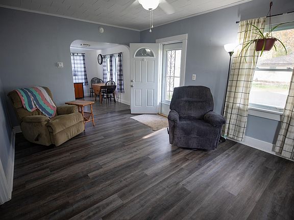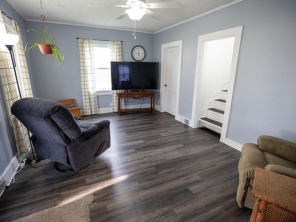Charming 3-bedroom, 1-bath home on a corner lot, just on the outskirts of town. Updated kitchen features soft close drawers, and the bathroom/laundry area has been tastefully renovated. A cute foyer welcomes you inside, offering a convenient space to hang coats. Lots of updates including updated flooring on the main and upper floors and a metal roof with a lifetime warranty. Upstairs, a spacious master bedroom awaits with two closets for ample storage. Outside, enjoy the fire pit in the large yard. A detached one-car garage provides additional storage. Located close to the local library and schools, this home offers comfort, convenience, and charm.