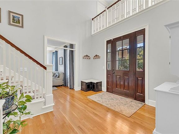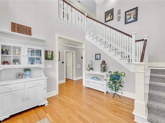 Drive past the community lake & through the serene forest to discover this stunning European design home, perfectly complemented by a charming Cottage Garden. As you approach, a covered front porch w/a welcoming porch swing & Romanesque columns invites you into an expansive 2-STY foyer adorned w/gleaming WD FLR. To the right, the cozy Liv RM flows seamlessly into the dining RM, which features a built-in window seat flanked by decorative shelves. The dining RM connects to the expansive kitchen & hearth RM, where a massive BKFST island w/an integrated cooktop, quartz countertops, & picturesque window above the undermount sink overlooks lush backyard & multi-tiered paver patio. The kitchen is equipped w/SS appliances, including a built-in oven & micro. The adjoining hearth RM, complete w/a gas FP, opens to a side portico featuring a 2nd porch swing & view of 3-car side entry garage. Adjacent to the hearth RM, you'll find a practical laundry/mud RM & a spacious office w/built-in cabinets, which also offers access to the patio. The owner's suite, located just past the 1/2 bath & laundry chute in the hallway, boasts a vaulted ceiling w/accent lighting, an en suite bath w/a luxurious soaker tub, dual walk-in closet, shower, double vanity, & quartz countertops. A gorgeous staircase leads from the foyer to the 2nd floor, where 2 BRs, each w/ceiling fans & walk-in closets, share a Hollywood bath w/individual vanities & a shared shower/tub area. A 3rd BR offers a walk-in closet w/attic storage access, & a private balcony overlooking the foyer. The daylight walk-up finished LL features a 2nd full kitchen w/SS appliances, an expanded craft closet area, a family RM w/built-in dry bar, a 4th BR w/a private bath that opens to the back paver patio & abundant storage. Surrounded by meticulously designed cottage gardens, this home is a true designer's dream, offering an idyllic retreat from the hustle & bustle. The extra deep garage is pre-wired for future EV charging.