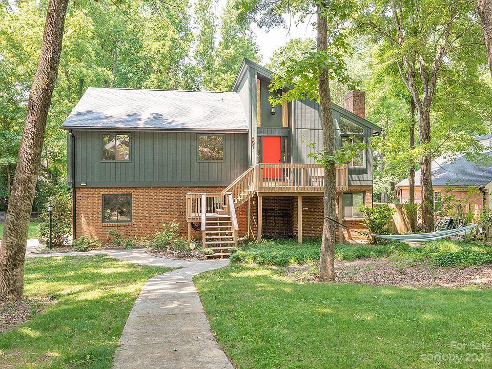 LOCATION! Close to Downtown Matthews and Center City Charlotte. A unique California Contemporary on a spacious CORNER LOT, with shade trees and fenced yard. Cathedral ceiling, an OPEN FLOOR PLAN, electric fireplace in the den, and tree house views from the living room. Recent updates including, a new HVAC in 2021, fresh paint, lighting, granite countertops, and stainless steel appliances. Showing start June 16.