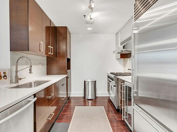 Your Own Private Yard!! Spacious two bedroom with garage parking and private yard/patio! Welcome to the Observer Lofts, a concrete-and-steel elevator building in Downtown Hoboken, across from the beautifully landscaped Southwest Park and upcoming Southwest Market, with planned retail and public spaces and brand new supermarket. This spacious two-bedroom, two-bath residence features a gourmet chef’s kitchen with quartz countertops, Sub-Zero refrigerator, Viking range with vented hood, Miele dishwasher, and a built-in wine fridge. Enjoy an open-concept living and dining area with wide-plank cherry hardwood floors, recessed lighting, central AC/heat, in-unit laundry, and ample custom closets. The oversized primary suite boasts separate closets (one walk-in) plus a spa-like bath with soaking tub. The second bedroom opens out onto your own private southwest-facing yard/patio equipped with a dedicated water source - large enough for a grill, seating area, and greenery. This extremely unique feature is the perfect place for entertaining or simply relaxing in your outdoor oasis after a long day. Additional features include, custom blinds with bottom up capability and black out functionality, with tech perks including a ButterflyMX smart intercom and NEST Wi-Fi thermostat. The Observer Lofts also offers bike storage for added convenience. Commuters will love easy access to I-78, Routes 1&9, the Holland Tunnel, and nearby PATH, bus, ferry, and light rail. Enjoy all that Hoboken has to offer—boutique shopping, dining, cafés, farmers markets, and parks—right at your doorstep. One garage shared tandem parking spot included.