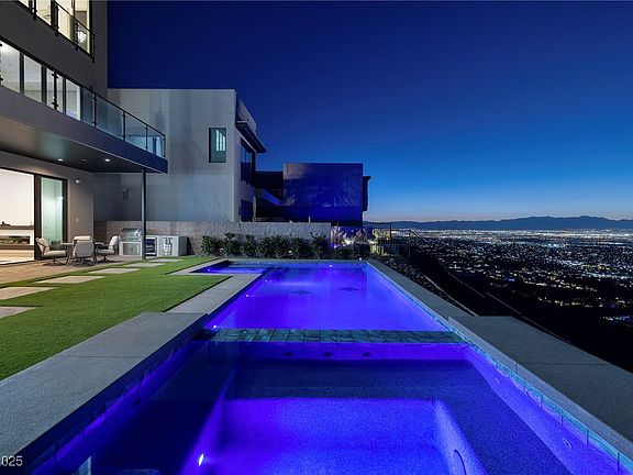 PRICE IMPROVEMENT—now offered at $4,290,000. Discover brand-new luxury in this 5,165 sq. ft. Sky Vu at MacDonald Highlands home with breathtaking Las Vegas Strip, city, and mountain views and over $200,000 in upgrades. The gourmet kitchen features Wolf and Sub-Zero appliances, quartz countertops, and bar seating at the island opening seamlessly to the great room and dining area. Pocket sliders create effortless indoor-outdoor living. The home includes four bedrooms with ensuite baths and custom walk-in closets. Take the elevator to the sky loft penthouse suite for an unmatched view of the Strip. The outdoor space is perfect for entertaining or relaxing, with a pool and spa, fire pits, and a BBQ area.The community enhances the lifestyle with golf, multiple dining options, a state-of-the-art fitness center, and pickleball and tennis courts. Don’t miss the opportunity to own a piece of Las Vegas luxury.