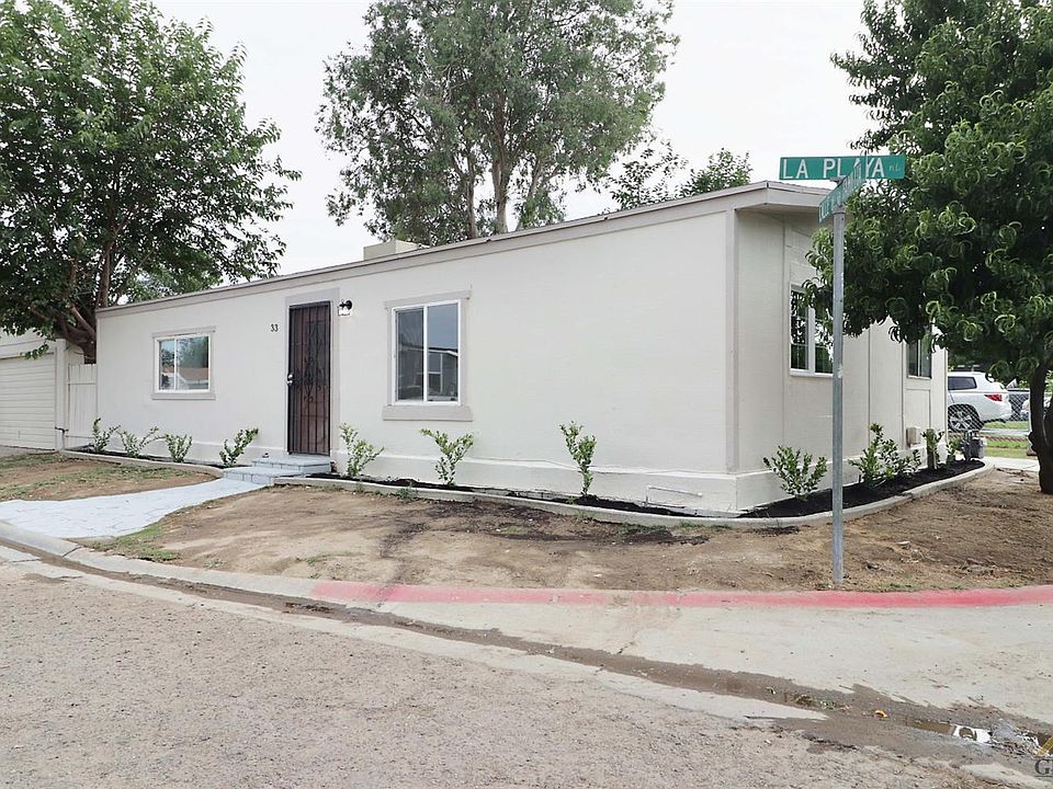 On its own lot! No space rent...EVER! Extra large corner lot allows plenty of parking PLUS there is a drive way for more parking on BOTH sides and ADDITIONAL parking is right next door in the community parking lot! The inside looks and feels brand new with bright new paint, new appliances, new lighting fixtures, new flooring...new, new, new! Swamp cooler provides low cost cooling for most of the year while the built-in wall AC unit in the great room will certainly keep the home cool during the summer months. Seller is willing to install more window/wall AC units as well. Very large living room and dining room that adjoins the kitchen is perfect for families that love being together in one big great room. Front bedroom is perfect for guests while the master bedroom in the rear has its own full private bathroom. Nice private backyard. Full interior walk through video is available! FHA, VA, and Conventional buyers are appreciated! Full, detailed interior video available upon request.