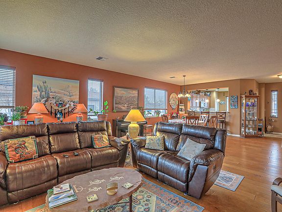 Nestled at the base of El Cerro Mountain, your new home awaits! Premium upgrades include wood floors, larger low-maintenance lot, and the flexibility of a 3rd BR or office. Spacious, bright kitchen inspires with gorgeous granite countertops, warm alder wood cabinets, stainless steel appliances, and plenty of storage in two pantries. New carpet in bedrooms. Grapevines, plum and apple trees, and planting beds abound for your gardening pleasure. Amenities including an 11,000 sf clubhouse with gym, swimming pool, hot tub, pickleball, bocce, observatory, and more ensure that you have plenty of activities in this 55+ active adult community. Access to hiking trails at the neighboring El Cerro Preserve. Easy access to I-25; approximately 20 minutes to nearby Albuquerque and the airport!
