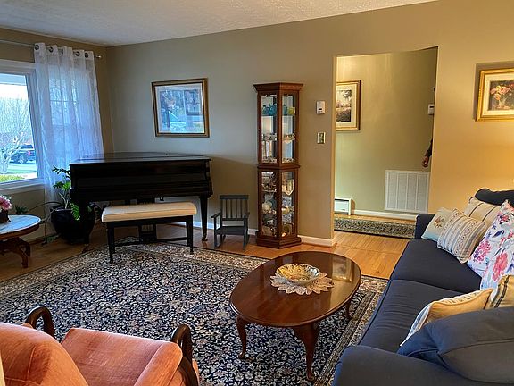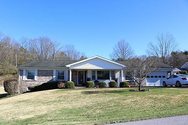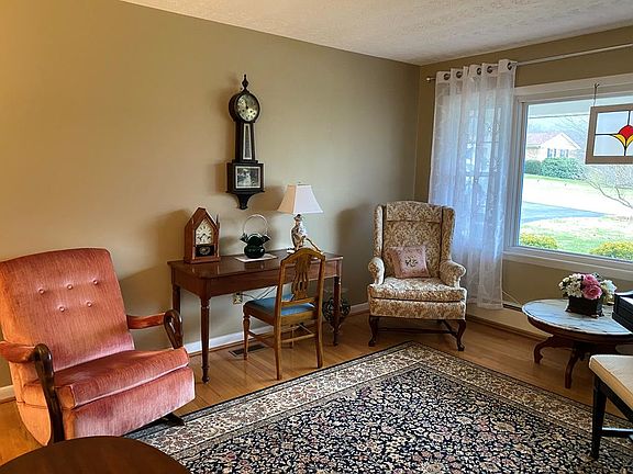 Beautiful brick ranch with neutral paint, hardwood floors, update oak kitchen with breakfast bar, stone front porch for rockers, sun room to expand the family room, formal living and dining, laundry on main, garage, and full basement! One of the largest lots gives privacy and a view. Heat pump (2013) adds comfort year round with electric baseboard for backup. Cable TV in every room. Water heater replaced in 2014. Attic steps in garage. Basement has heat and AC, with tall ceilings.