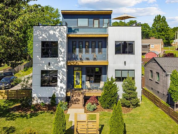 One of Nashville's best skyline views from a rooftop deck!! Entertain or watch holiday fireworks in style! Contemporary 3 BR, 3.1 BA well-appointed home w/ lots of windows & balconies for breathtaking, unobstructed views from any level. Sleek design w/chefs kitchen, open to great room/dining & fantastic owner's suite w/ a view. Other features: 1st flr guest suite, 3rd floor loft w/ kitchenette, oversized 2-car garage, large private backy, w/deck, hot tub, patio & fire pit. A must see!