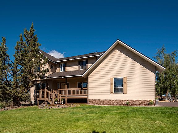 Difficult to find home in country yet only minutes to town located in Pride Estates. Idyllic setting on 5+ acres w/2.5 acres of COI irrigation, mountain views of Bachelor, Mount Jefferson and Black Butte, large fenced pasture ideal for horses, cattle, etc. Enjoy privacy among mature junipers and take in the sights of 2 large storage buildings, 2 agriculture buildings, 1 for shelter and 1 for hay, and a 43'x30' pole barn shop complete w/5 garage doors - 1 is an RV door that can accommodate a 30' RV. Continuing, front and back are landscaped and include a custom tiered water feature as well as a large concrete patio and fire pit ideal for entertaining. Step inside the 4-bed, 2.5 bath home to discover granite counters, stainless appliances, a custom pine wood staircase, doors, accents and more. River rock Fireplace Xtrordinair also has a custom pine wood mantle. The home has had 2 owners and is well take care of. Brand new interior paint, carpet and roof with transferable warranty.