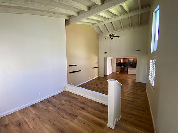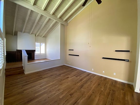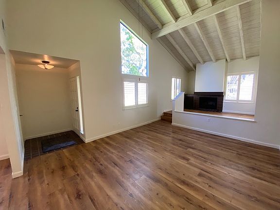 This charming condo offers approximately 1,267 square feet of living space. The entrance features a quaint patio surrounding the front door, leading into a spacious living room with vaulted ceilings, a cozy fireplace, and luxury vinyl plank floors. The updated kitchen, open to the living room, boasts a gas range/oven, stainless steel refrigerator and dishwasher, a split stainless steel sink, and ample cabinet storage. Sliding glass doors from the dining area and a door from the kitchen provide access to a spacious private patio. The front bedroom includes a large closet with plenty of storage space. The hall bathroom features a shower-over-tub arrangement. The hallway includes a convenient enclave with a courtesy washer and dryer. The first bedroom also has a sliding glass door leading to a second private patio. The spacious primary suite offers abundant closet storage with mirrored doors and a bathroom featuring dual vanity sinks and a walk-in shower. A detached two-car garage is located just off the front patio. Excellent Location: Walking distance to grocery stores, restaurants, and schools. Additional Details: Tenant responsible for utilities, except water, sewer, HOA Dues and basic gardening. Detached two-car garage. Courtesy washer and dryer in hall closet. No smoking. Sorry, no pets. Available now!