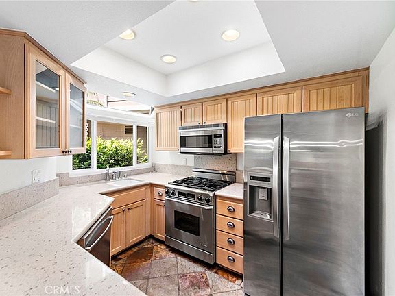 Laguna Beach Townhome with Canyon & Hill Views – Premier Location on Highest Tier of Community. This upgraded townhome offers views of the surrounding hills and Laguna Canyon, along with ocean breezes and added privacy. The remodeled kitchen includes quartz countertops, a breakfast bar, Dacor appliances, and a newer refrigerator. The main level features slate stone and wood flooring with an open-concept layout and bright living areas. An open staircase leads to the upper level. Upstairs are two primary suites. The main suite includes vaulted ceilings, a walk-in closet, a secondary closet, and a bathroom with soaking tub and double vanity. The second suite features a remodeled walk-in shower and updated vanity. Additional features include a skylight above the staircase with a retractable screen, fresh interior paint, an attached one-car garage, driveway parking, and a detached single-car garage. Community amenities include a pool, spa, greenbelts, and guest parking.