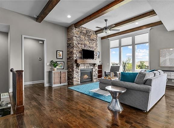 The search is over- You will fall in love with this Reverse 1.5. There are 2 Bedrooms on the Main Level and 2 Bedrooms in the finished lower level. The Master Bedroom is spacious with plenty of room for your furniture. The Master Bath features both a tub and walk in shower. The closet will leave you super impressed. The pull down closet rods give you so much extra storage- The organization ideas are endless in this one! Laundry is off the Master Closet and the garage- So Very convenient. So many things to love in the kitchen. An oversized "legged" island, walk in pantry, many cabinets and a gas stove. Don't miss the giant oversized sliding doors that lead out to the deck-Such a nice upgrade! Beautiful Hardwoods run through the entry, kitchen and living room. Be sure to look up at that gorgeous beamed ceiling in the living room, and notice all of the beautiful natural light that comes streaming in. The lower level has the same gorgeous natural light, so much so, that it is easy to forget you are in a basement. The wet bar is great for entertaining, and the living space is HUGE so everyone has room to spread out. Just like on the main level, Bedroom 3 and 4 are generous in size. Be sure to take note of all of the storage that is available in the basement- You will be surprised!Woodland Trails is a highly desirable neighborhood in Greenwood, that feeds into the Lee's Summit School District. There is an unbelievable community pool, miles and miles of walking trails and even a stocked ponds to fish in. 2022-08-16