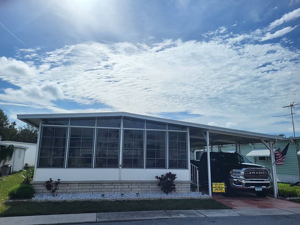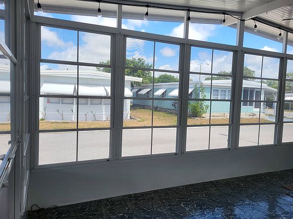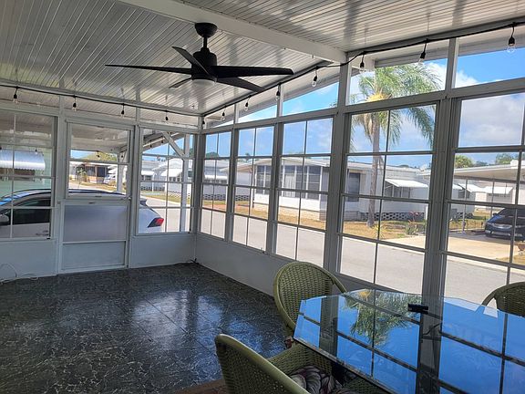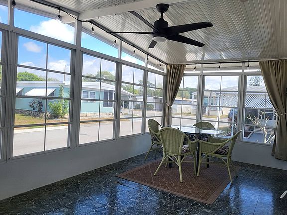 CHECK OUT this LOVELY 2/2 with 2021 AC/HEAT and NEW VINYL SURROUND SHOWER in Guest Bath. LIGHT and BRIGHT with great floor plan. You will love having an ENCLOSED SCREENED ROOM with Vinyl Screen Covers that enable you to use the room in Cold or Wet Weather (do we have that here?) as well as completely remove the screens if you so choose in sunny weather. ~~~Furnished as pictured except for a very few wall hangings. THE DIAGONAL WALL in Kitchen/Living Room makes both rooms larger! See to believe when you view.~~~FRONT SCREENED ROOM has its own Front Door Entrance. You will live in this great room which is accessible to the main living area by Sliding Glass Door.~~~LARGE EN SUITE BEDROOM occupies entire rear portion of the home. There is a Walk In Closet as well as another Spacious Closet in the Dressing Area of the En Suite. En Suite Bath has Step In Shower, Lots of Storage, Toilet.~~~GUEST ROOM across from Guest Bath is spacious.~~~LONG CARPORT EASILY PARKS 2. STAMPED CONCRETE DRIVEWAY adds to curb appeal. SPACIOUS LAUNDRY/STORAGE shed.(BIKE in Shed doesn't remain). CONCRETE PAD by Carport for your grill.~~~RESPOND TO LISTING AGENT LISA, today for more information or to view. Park Credit and Background Check Required for purchase.