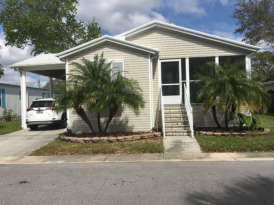 Beautiful Updated Turn Key Home..... this home has been extensively updated and well maintained. With 3 bedrooms, 2 baths and open concept living, dining room and kitchen with vaulted ceilings your entertaining will be a breeze. Plenty of room for family and friends. Home has beautiful new laminate throughout,new stain resistant carpet, new stainless steel appliances, including a Bosch dishwasher. Kitchen is open and bright with a granite counter top and room for barstools . Plenty of countertop space and cabinets, built in microwave. Dining room has beautiful new light , high end ceiling fans throughout . Large kitchen pantry with shelving. Laundry room has shelving and pantry for even more storage. The master bedroom accommodates a king size bed suite and has large walk in closet, master bath has a skylight and linen closet and a walk in shower with seating. The 2 guest bedrooms and guest bath are on the other side of the home for privacy. The guest bedrooms are large enough for a queen bedroom suite and also have large closets. The guest bath has a beautiful skylight with tub/shower combo. The living room door opens into a screened Lanai with a platform wheelchair lift and inside shed . Family area opens out into a front screened in porch with beautiful palm trees to look at while you enjoy the Florida breeze. Also this home has extra large doorways and hallway plus a platform wheelchair lift for wheelchair/handicap accessible. Home has vinyl siding, new metal roof over with warranty, new AC, and hurricane shutters. Home also has a nice Rubbermaid shed out back for even more outdoor storage. Beautiful yard with nice green grass and landscaped with mature palm trees. Driveway is long enough for 2 cars . Located in East Bay Oaks an age restricted park that has a pool, hot tub, large clubhouse with many activities and pet friendly (2 pets under 25lbs) motorcycles are also allowed. Only minutes from the famous beaches, shopping and the airports. This home is truly a hidden gem ! Call today to see for yourself. All listing information is deemed reliable but not guaranteed and should be independently verified through personal inspection by appropriate professionals. American Mobile Home Sales of Tampa Bay Inc. cannot guarantee or warrant the accuracy of this information, measurements or condition of this property. Measurements are approximate. The buyer assumes full responsibility for obtaining all current rates of lot rent, fees, or pass-on costs associated with the community, park, or home from the community/park manager. American Mobile Home Sales of Tampa Bay Inc. is not responsible for quoting of said fees.