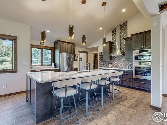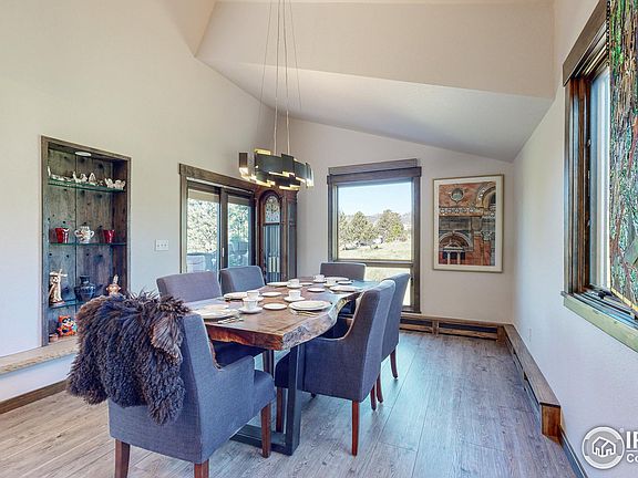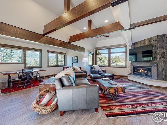 UNIQUE totally renovated High End Mountain Modern home by B & E Builders. Designed by Tamlin McDonald of Prodigy Development Group and Decorated by Chris McGuire. This home has the LOCATION and VIEWS! Situated in a neighborhood just beyond The Historic Stanley Hotel and is surrounded by natural common areas to feel like you're immersed in nature - with views of a lily pond just beyond the deck that the Moose and Elk love! Imagine sitting on the deck and enjoying your coffee with the wildlife and views of Longs Peak, then take an afternoon stroll to the Historic Stanley Hotel for fine dining and entertainment. Another short block to the grocery store or into town to enjoy all that Estes Park has to offer. Work from home with 1GB Upload and download internet speed looking at Longs Peak out of your window. The home has been thoughtfully designed inside and out. Exterior is western steel from Wyoming. Includes new roof and all new Pella windows. Inside, the gas fireplace has been surrounded by repurposed White Oak box-car flooring for an elevated rustic ambiance. The kitchen details include Bosch appliances, Alder wood cabinets, and beautiful quartz stone tops that details like a river runs through it. Partial in-floor radiant heat where it counts, new boiler + endless hot water system. The Main bedroom has North Carolina Poplar Bark tiles on the accent wall for a luxurious natural surround. Ensuite bath includes a steam shower and soaking tub with spacious walk-in closet. Walk-out basement with outdoor patio affords more entertainment space. Main level laundry, partially fenced yard for your pets, and storage unit make this home as functional as it is beautiful.